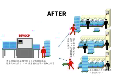今まで数名が作業を止めて折りコンを組み立てていましたが、専任者を配置することで流れを止めずに作業を継続できます。具体的には、ある一定の枚数の折りたたみコンテナを、作業者一人がコンテナ組立機(DIVGCP)を使ってまとめて組み立てることで、最小限の人員移動業務を止めずに作業を継続できます。