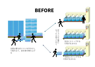 ・空の折りコンのストックがなくなる度に、都度作業の手を止め、折りコンの組立作業を数名で行うため効率が悪い。